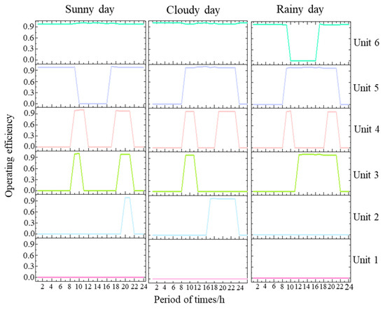 Figure 15 shown the operational efficiency changes of each unit during different time periods. It can be observed that during the operation periods of the units, their efficiency remains above 0.9, indicating that each unit operates efficiently and stably under current conditions, while also completing the peak regulation tasks within the phase. On rainy days, there are relatively more shutdown periods for the units, possibly due to lower external loads in such scenarios. On sunny days, the proportion of time periods where the units operate in high-efficiency zones is relatively low compared to cloudy days. This is because, on cloudy days, the reduction in photovoltaic output and increased uncertainty requires the hydropower units to rapidly increase output or quickly change unit combinations to compensate for the fluctuations in photovoltaic output, resulting in longer overall operating periods for the units.