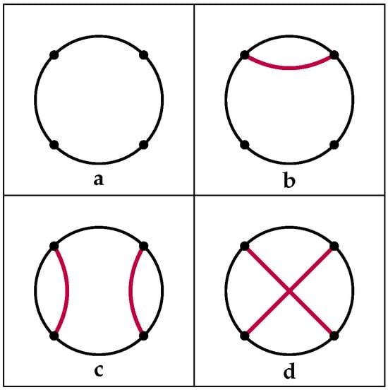 These latter integrals can be represented by means of diagrams inspired by the Feynman diagrams that we introduced in the previous section. Let us consider for the sake of simplicity the one-dimensional case (), with . By basic computations, we obtain , namely, if one depicts a circle with two points, the addendum 1 is the no-chord diagram, and the term a is the diagram with chords joining the two points. Now, it is also possible to represent , where, in addition to the no-chord diagram, there are also six one-chord diagrams (all the possible combinations) that provide the term . Finally, are intuitively the three possible combinations of two-chord diagrams (see Figure 5 for some examples).
