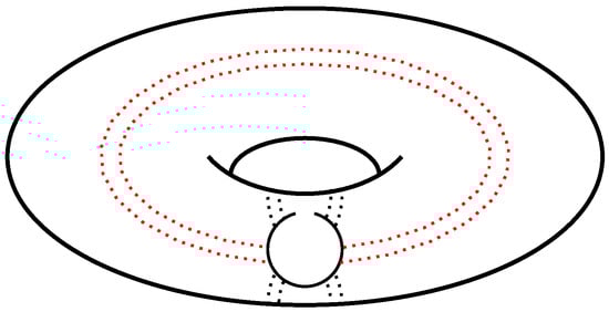 Now, in terms of crossing diagrams, pseudoknots can be computed by using the genus of a surface. Topologically speaking, the genus of a surface is the number of holes or handles of a (orientable) surface. In this framework, the genus of a diagram can be defined as the genus of the surface with the lowest genus, in which our diagram can be drawn with no intersections. In particular, if we consider the case of the kissing hairpin, we obtain the representation in Figure 7, in which the diagram appears embedded in a surface with genus , namely a torus.