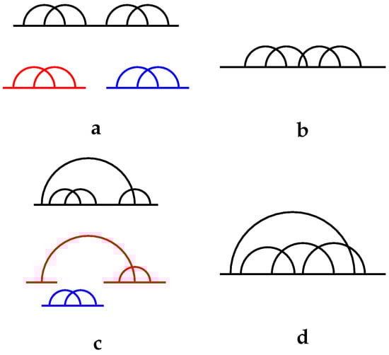 Now, we want to stress two more properties about pseudoknots that turn out to be very important for computational reasons. The genus of a diagram is an additive quantity, and so it is possible to provide two notions to characterize the intrinsic complexity of a pseudoknot, namely the concepts of irreducibility and nested pseudoknots [42]. A diagram is said to be irreducible if it cannot be split into two disconnected parts by cutting a single line, as in Figure 8b. In parallel, a diagram is said to be nested in another one if it can be removed by cutting two lines and keeping the rest of the diagram connected in a single component, as in Figure 8d. These two definitions can be combined as follows: if a diagram is both irreducible and non-nested, it is called a primitive diagram. Other interesting details about genuses and pseudoknots can be found in [32,33,39,42,44].