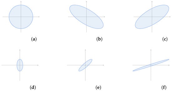 The effects of the parameters a and s on the support of a function . The support of (coinciding with ) is shown in (a) and every figure reports the support of for different values of a and s (while the location parameter is always set as ). All the figures have the same scale. (a) and , (b) and , (c) and , (d) and , (e) and , (f) and .