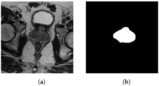 In (a), a slice of a MR image containing a prostate (in the center). In (b), the corresponding mask containing the ROI (the prostate manually segmented by the radiologist).