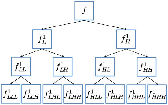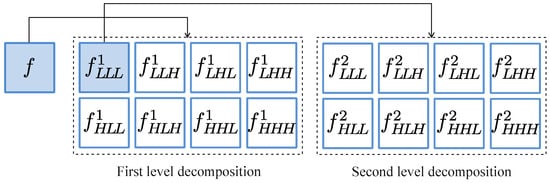 - In the first level decomposition, the image f is decomposed in an image and an image by applying a low-pass filter and a high-pass filter on the first variable, respectively (low-pass refers to low frequencies, while high-pass to high frequencies). Next, is decomposed into an image and a image applying the filters with respect to the second variable, respectively. The same is carried out for and produces and . Finally, starting from , , , , similar decompositions are performed in relation to the third variable and eight images are obtained, , , , , , , and . The first of the eight images is called the approximation coefficients image at the first level, while the other ones are called detail coefficient images at the first level. This decomposition is shown in Figure 3.