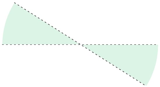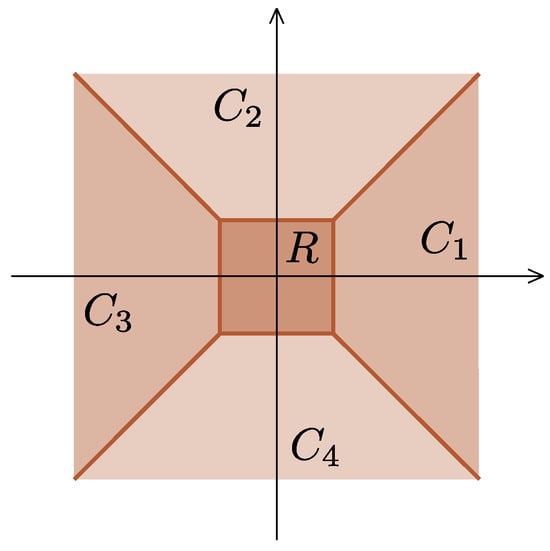 Despite the similarity with the wavelet transform, Equation (2) of the shearlet transform presents a directional bias problem for large values of s, see Section 4.3 of [] (the problem of large values of s can also be seen in Figure 1: the support of tends to stretch as s increases). Thus, to limit the range of s, a variation was proposed. First of all, the Fourier domain is divided into four cones and a square R centered around the origin as shown in Figure 5. The square is the low-frequency region and in each cone the orientation varies over a bounded range.