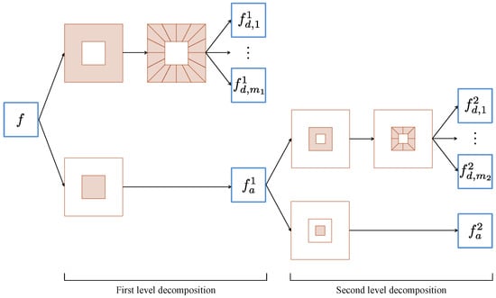 To apply the cone-adapted shearlet transform to images, a discretization is made performing the so-called non-subsampled shearlet transform (NSST) []. In particular, we used the toolbox for MATLAB available at https://www.math.uh.edu/~dlabate/shearlet_toolbox.zip (accessed on 15 March 2024) and made by the same authors of []. The NSST is resumed with the following level decomposition scheme, represented in Figure 6.