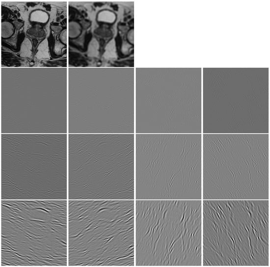 As we did about the SWT, we remark that by applying the NSST all the images obtained have the same sizes of the original image f. This is important because in radiomics a mask containing the ROI must be overlapped to an image of the same sizes. Figure 7 shows a NSST decomposition with three levels and four orientations of a slice of a MR image containing a prostate (in the center).