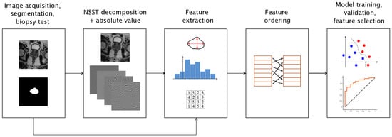The steps of the proposed method. From the MR images and corresponding segmentations of the prostate, NSST decomposition (followed by the absolute value) was applied to the images to extract radiomics features using PyRadiomics. These features were then ordered and selected for training and validating the machine learning models for the prediction of the lesion type (taking into account the histological results obtained from the biopsy).