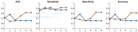 Table 3 contains the results of the performance evaluation explained here for the three methods in comparison (AST: features extracted from the original images and from the preprocessing with the Absolute Shearlet Transform; WT: features extracted from the original images and from the preprocessing with the Wavelet Transform; Original: features extracted only from the original images). Additional evaluations, concerning TP, TN, FP and FN numbers, are in Table 4. For AST and WT methods the values refer to the best result over the total decomposition levels from 1 to 6. In particular, as one can see on the AUC graphs of Figure 10 and Figure 11 related to the most performant models (linear discriminant analysis and linear SVM), the best result for AST is obtained for the total of levels equals to 5, while the best result for WT is obtained for the total of levels equals to 2.