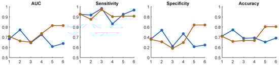 Plots of the means of the performance indices of the best linear discriminant analysis model for different levels. In red: model trained with the absolute shearlet transform. In blue: model trained with the wavelet transform.