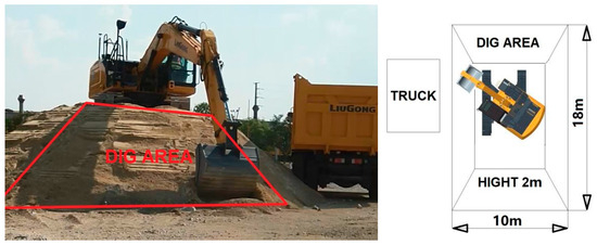 The task scenario involves excavation and loading on a high platform, with the angles of excavation and unloading being approximately 90 degrees.