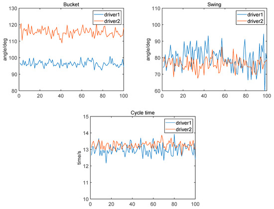 To ensure the consistency of the operator data collected during the operations, it is required that the operators refrain from moving the excavator tracks and only perform rotation, excavation, and unloading actions. Operator 1 conducted a series of 20 consecutive excavation and unloading operations before site restoration, followed by Operator 2 performing excavation operations under identical conditions. The real-time collection of operational trajectory data was carried out for both operators. After eliminating significant differences in the data curves, a final set of 19 valid excavation data points were obtained for Operator 1, while Operator 2 yielded 12 valid sets.