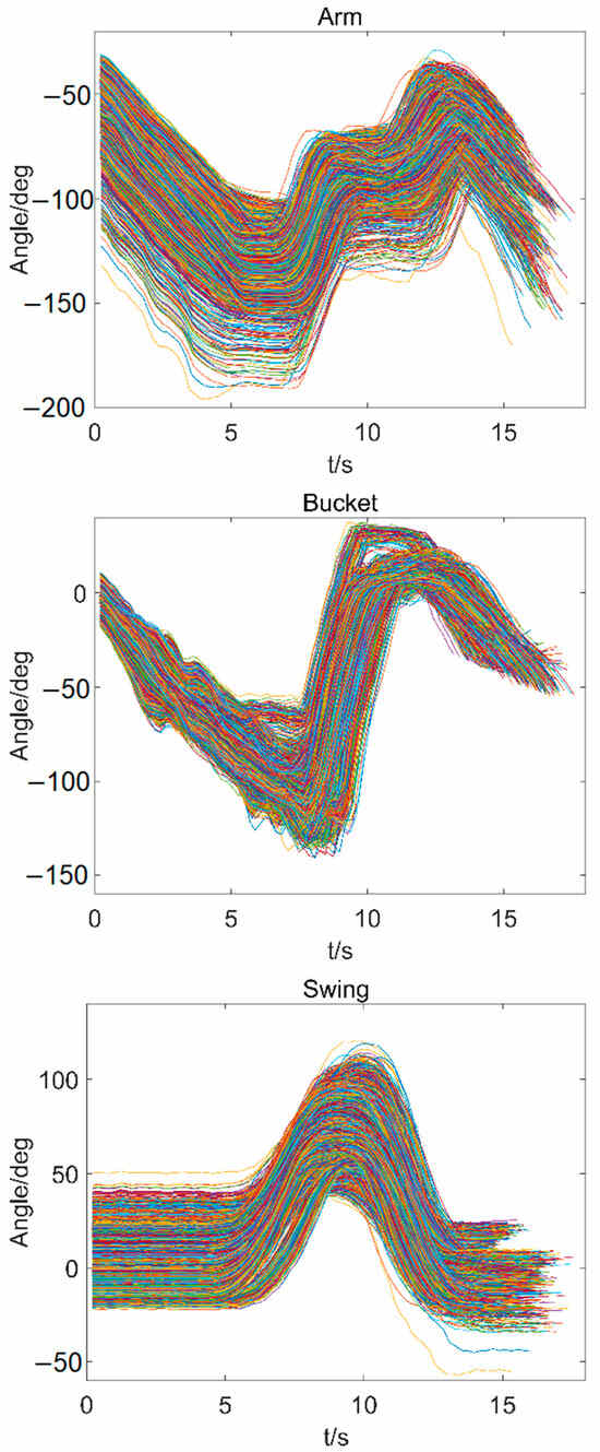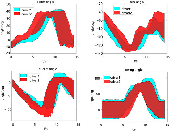 By analyzing the spatial motion trajectory of the excavator bucket tip in the machine coordinate system, as well as the individual motion trajectories of its four joints, we have chosen to focus our research on the most representative curves of these four joints. The accompanying diagram presents contour plots depicting these joint trajectories during operations conducted by two skilled operators. From these motion trajectory curves, it can be observed that both operators’ work paths exhibit overall similarity while also displaying distinct personal characteristics. For instance, in terms of arm trajectory, Operator 1 demonstrates a comparatively slower lifting speed compared to Operator 2; however, their boom lowering speed is relatively faster. In contrast, Operator 2 exhibits a higher level of consistency when reaching maximum angles—a quality noticeably absent in Operator 1’s curve (