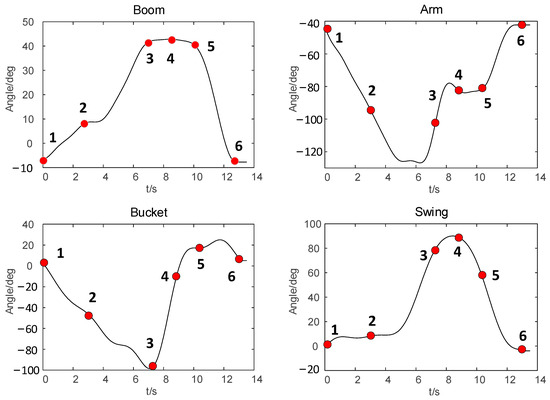 The excavation trajectory of each joint can be precisely fitted by employing a segmented cubic Bézier spline curve. The operator’s operation trajectory can be effectively segmented, enabling a seamless fit of all curve types, including straight lines, through the utilization of cubic Bézier curves. Consequently, the expressions for each joint’s trajectories can be standardized as cubic Bézier curves.