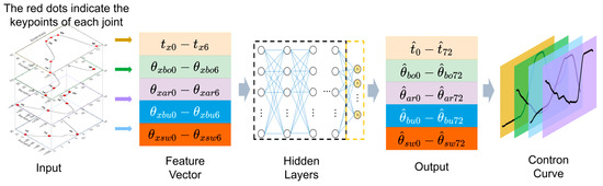By utilizing time, arm, boom, bucket, and swing angle values corresponding to six key points as the feature inputs for machine learning, we represent them as a one-dimensional vector of size 1 × 30. To establish the model labels, we uniformly sample 72 points from each joint curve of the operator and represent it as a one-dimensional vector of size 1 × 360. Following model prediction, the output is presented as a one-dimensional vector of size 1 × 360 according to