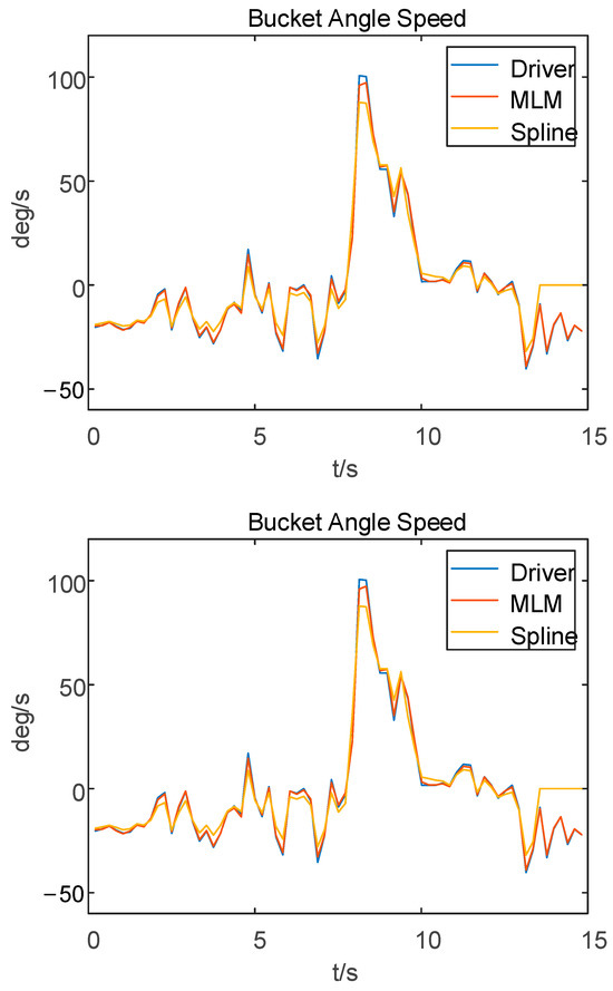 Based on the aforementioned comparison, it is evident that all three models exhibit a consistent trend in terms of changes in their movement speeds. In contrast to the operator-controlled trajectories, both the machine learning model and the spline curve model demonstrate a decrease in the maximum speed; however, the machine learning model experiences a more pronounced decline. This suggests that the control system enables target trajectory tracking for the machine learning model with reduced energy consumption, thereby highlighting its superiority over the control system (