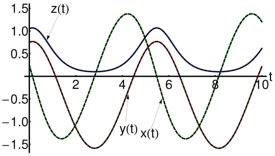 In choosing arbitrary values for the initial conditions , and , the profiles of the approximate analytic solutions , , and are represented in Figure 2 and Figure 3, highlighting the accuracy of the analytical procedure.