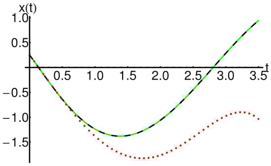 The iterative solutions become the following after five iterations, when considering the initial conditions , and (presented in Table 4) and when taking into account algorithm (40):