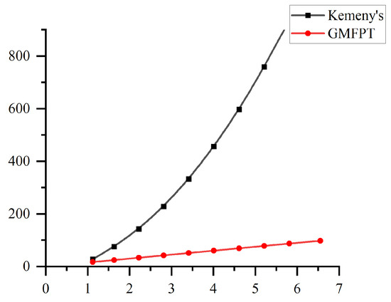 The comparison study of Kemeny’s constant and the GMFPT entails the examination of resulting metrics to evaluate the network efficiency, navigability, robustness, and scalability. The GMFPT gives insight into the average time it takes for objects to traverse the spiro-ring network, which is useful for assessing the overall network efficiency. Researchers can evaluate the impact of various network configurations or characteristics on the network efficiency and navigability by comparing the resulting matrices of the GMFPT and the Kemeny constant. These comparative studies offer useful insights into the efficiency and features of spiro-ring networks (see also Figure 5). They inform the design of networks, optimization methodologies, and decision-making processes to improve network efficacy in different applications.