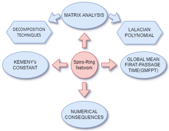 In order to overcome any potential limitations of the graph spectrum method, we used the decomposition theorem of Laplacian polynomials to compute the Laplacian matrix, GMFPT, and Kemeny’s constant for spiro-ring networks. This methodology enabled us to surpass the constraints of the graph spectrum method by integrating supplementary mathematical tools to obtain more precise analysis and outcomes.