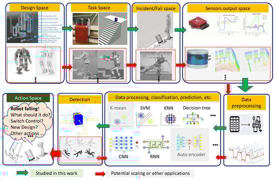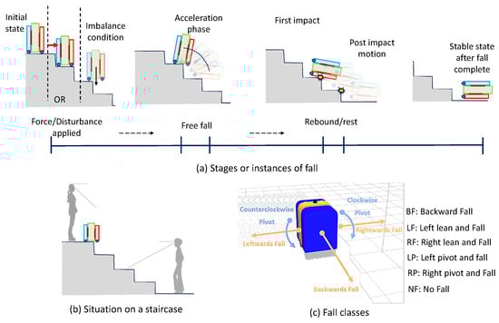 In studying falls, whether for robots or humans, accurate detection, classification, and forecasting are crucial. Detection involves identifying the occurrence of a fall event or the presence of specific incidents in a given context, i.e., detecting whether a fall has happened based on sensor data or environmental cues. Wang et al. [] detailed various fall detection technologies and reported their sensitivity and accuracy. Classification refers to assigning a label or category to a fall event based on predefined classes, for example, backward/forward falls, left/right leaning falls, and slip/spin falls. In Kerdjidj et al. [], human activities such as sitting, running, standing, and falling were classified based on data from wearable sensors. Forecasting or prediction refers to foreseeing future fall events based on historical data or patterns. One example is the gait-based human fall prediction model using deep learning approach employed in Sampath et al. []. The significance of fall recognition lies in its ability to trigger appropriate responses and mechanisms to mitigate damage caused by falls. This paper further explores fall detection, classification, and forecasting along with their application in the context of a service robot employed in staircase cleaning.