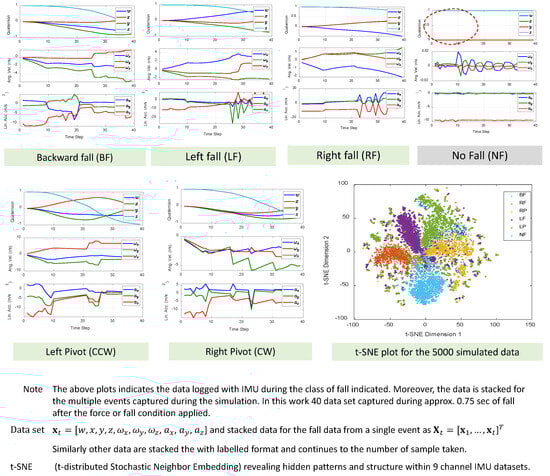 Data Preprocessing: The raw data collected from the IMU sensor were preprocessed to ensure uniform dimensions suitable for machine learning algorithms. Specifically, trimmed data segments of approximately a seconds were extracted (Figure 11c) starting from the moment the fall event started. The trimming process ensures consistent data lengths for training the models, and was used in this paper instead of the padding method. Padding adds elements to sequences to make them uniform in length, while trimming removes elements to achieve the same data lengths. Trimming was used here because the falling events under studied included no significant contextual information before or after the event that would be useful in classification or forecasting of the fall. Figure 11d highlights the t-SNE plot for the 50 events for each class of fall taken during the experiments. The separation between clusters suggests a significant difference in these shared characteristics. There is very little data mixing or overlapping in a cluster, which can be caused by incorrect classifications during the experiments or other factors such as the numerical value assigned to the perplexity, which controls the “local neighborhood” considered for each data point.