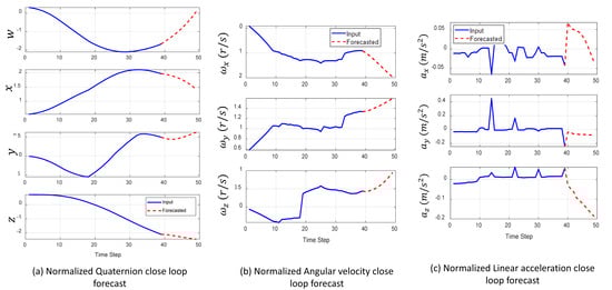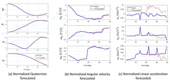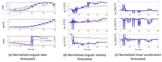Figure 14 shows the results of time series forecasting performed on fall data using the BiLSTM model. The BiLSTM model was used because it showcased higher performance in the simulations. The blue line in each plot in Figure 14a–c represents the input data. This is the actual sequence of sensor readings (normalized angular data, normalized angular velocity, and normalized linear acceleration) captured by the IMU. Moreover, the red dotted line represents the forecast data. The BiLSTM model was used to predict future values in the time series data, i.e., from IMU sensor readings during a fall. By analyzing the predicted changes in angular data, angular velocity, and linear acceleration, the model can potentially identify patterns that lead to falls in advance.