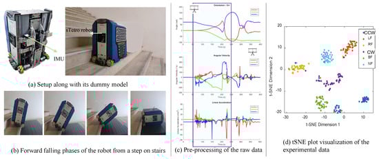 Staircase-cleaning robots represent a significant advancement in robotics for facility maintenance. Cleaning robots form a major sector of the commercial robots in use today, with a global market valued at USD 8.34 billion in 2021 and a compound annual growth rate of 22.7% []. Among cleaning robots, floor cleaning robots are the most common []; however, conventional floor cleaning robots are unable to handle staircase environments. One reason staircase robots in general are rare and commercial staircase cleaning robots nonexistent is that staircases represent a risky operating environment. Robots are susceptible to falls caused by collisions with people or objects as well as from errors in movement resulting in a loss of balance. In a case where a robot falls from the staircase, it will likely slide or tumble down the stairs, causing severe damage to the robotic system and anything in its path. The inherent risk and large impact of falls during operation necessitates the development of intelligent systems capable of fall recognition and prediction to ensure the safety of the robot, prevent damage to the surroundings, and mitigate potential injuries to people nearby.