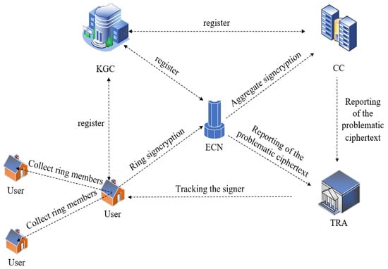 However, there are still unresolved issues within the SG. One of the significant challenges pertains to concealing the user’s identity within the SG, while also ensuring efficient and rapid completion of signcryption and unsigncryption. At present, many scholars have proposed solutions to this problem, but it can still be improved. The user’s private data are easily leaked or damaged during the transmission and storage process with the service node, which has a large security risk. For example, attackers can invade service nodes, which is much less difficult than attacking users or CC [2]. After hijacking edge service nodes, they can reasonably obtain information sent by both users and CC. This is a huge problem that was previously ignored.
