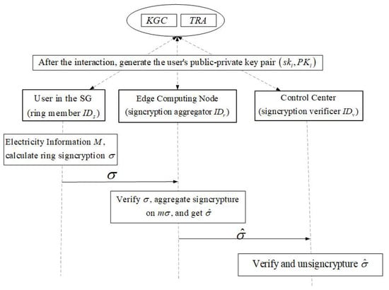 Ring signcryption is proposed as one of the main development directions of ring signatures. In the SG, ring signcryption has attracted much attention because it can encrypt messages while performing ring signatures. Liu et al. presented a trackable ring signature encryption scheme in [20], utilizing the SM2 algorithm. However, this scheme is not suitable for aggregation within smart grid applications. Zhang et al. introduced a ring signcryption scheme in [21], specifically designed to safeguard the privacy of smart meters. In [3], a privacy protection solution for smart meters in decentralized smart homes based on the alliance blockchain is proposed. In [22], Wang et al. proposed a lightweight certificateless aggregation ring signcryption scheme. In [23], Zhang et al. proposed a microgrid point-to-point e-bidding users based on ring signcryption.