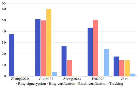 In terms of computational cost, since the literature we compare are all certificateless schemes, the computational cost of this scheme in the key generation phase is not much different from the schemes we compare and is mostly . The computational costs in the ring signcryption phase, batch verification phase, aggregate signcryption phase, aggregate signcryption verification phase and tracking phase of this paper are , , , , and , respectively.