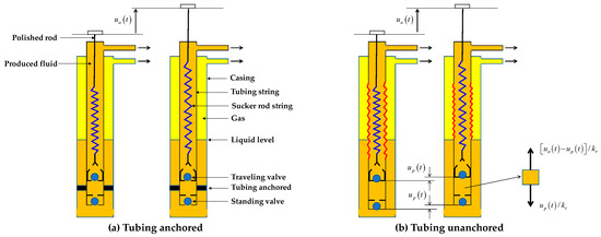 The normal pumping condition model should consider the anchored state of the tubing string. With the tubing string anchored, only the sucker rod string undergoes elastic changes during the plunger movement; meanwhile, in the anchored state, the sucker rod string and the tubing string also exhibit elastic changes caused by polished rod movement [28]. Considering the elastic movement, the sucker rod string and the tubing string can be equivalent to springs. A schematic diagram during the loading portion of the upstroke is shown in Figure 1.