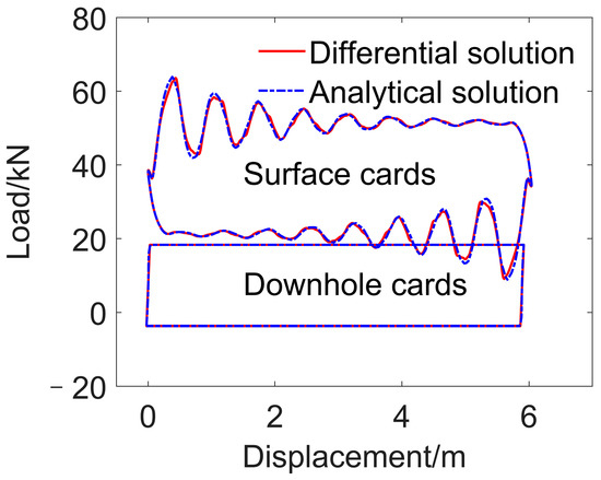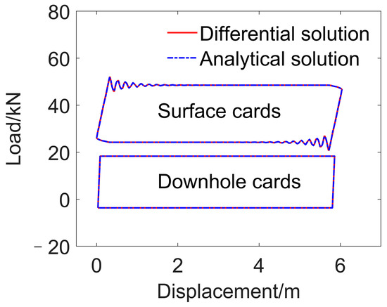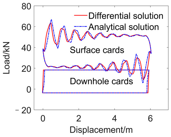 To further demonstrate the applicability of the algorithm proposed in this paper, the cards at a pumping speed of 5.0 min−1 are simulated by both solutions. The simulation results of the analytical solution after the first iteration are shown in Figure 4. As illustrated in Figure 4, for the downhole cards, the loading and unloading portions of the analytical solution are significantly smaller than those of the finite difference solution. In the surface dynamometer card, the amplitude of the fluctuation in the upper stroke and downstroke of the analytical solution is slightly smaller than that of the finite difference solution. Hence, the use of the static pump simulation model at this pumping speed will result in a larger error.
