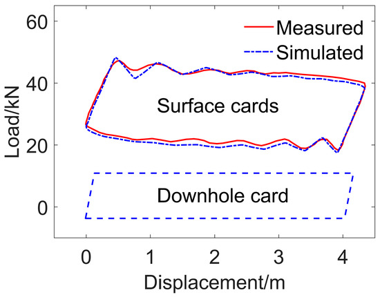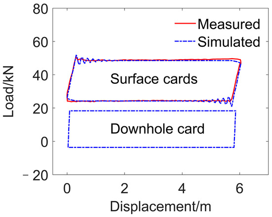 As illustrated in Figure 6, the simulated surface dynamometer card has good consistency with the measured card. As shown in Table 2, the loads and area predicted by the analytical solution closely matched the actual loads, especially for the card area, and the relative area error to the measured card area is 1.30%. The difference may come from errors due to dynamometer resolution.