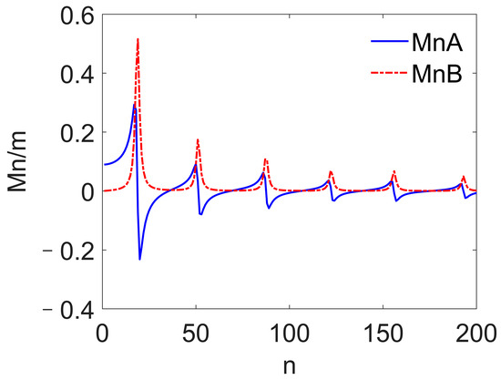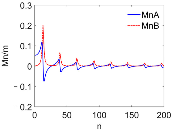 Thus, the convergence curve between the iterative matrix elements Mn and Fourier series number n can be drawn when solving the wave equation with Equations (4)–(10).