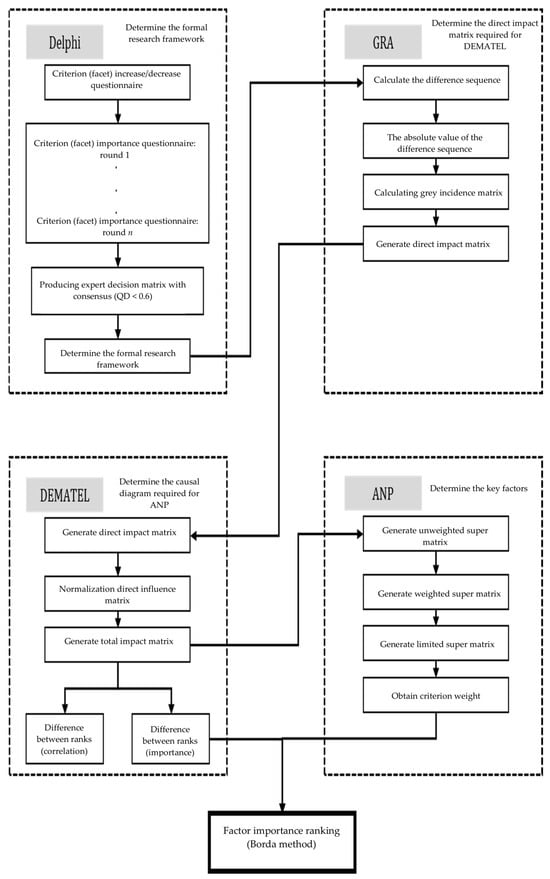 However, the ANP requires a large number of pairwise comparisons to form a pairwise comparison matrix, which also makes the consistency test difficult []. In general, scholars have found that using a single MCDM method poses difficulties in solving the problem efficiently and accurately, so scholars have begun to try to combine multiple MCDM methods, such as Grey DEMATEL [], Fuzzy DEMATEL [], and so on []. Therefore, a mixed model of ANP based on DEMATEL, i.e., the DANP, was proposed []. In this way, the total influence matrix generated by DEMATEL is directly taken as the unweighted super matrix of the ANP, thus not only improving the efficiency but also solving the problems that the way to form a pairwise comparison matrix is so complicated that cannot guarantee consistency. However, in practice, the direct influence matrix used by the DANP involves a pairwise comparison matrix that requires a pairwise comparison questionnaire, the design of which entails several problems. If the experts are unfamiliar with the pairwise comparison questionnaire, judgments are difficult, which affects the quality of the questionnaire data. In addition, a higher number of DANP indicators implies the need for a higher number of comparisons. This can easily bore experts, resulting in a decline in questionnaire quality. In view of this situation, the self-relational matrix generated by the GRA has been directly used as the direct influence matrix of the DEMATEL, and the research process of the DANP has been further improved [], thereby simplifying the above process and improving the effectiveness of the direct influence matrix.