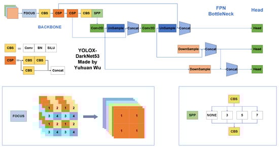 YOLOX [] represents an advancement in the YOLO series. As a high-performance detector, YOLOX employs advanced detection techniques, such as anchor-free detection, a decoupled head, and the SimOTA label assignment strategy. The architecture of YOLOX is depicted in Figure 1. Similar to the original YOLO, YOLOX consists of three components: a backbone feature network, a feature pyramid network (FPN), and a YOLO head as a detector.