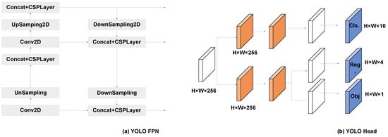 Differently from the previous YOLO head, the YOLOX [] head detector implements classification and regression in separate convolutional layers. Three features obtained by FPN are integrated into the YOLO head for prediction. The structure of the decoupled head is illustrated in Figure 2b. The “Reg” part is used to determine the regression parameters for each feature point and adjust the prediction boxes. The “Obj” part is used to determine whether each feature point corresponds to an object. The “Cls” part is used to determine the type of object.