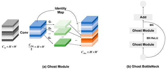 Firstly, the Ghost module obtains the intermediate feature maps through regular convolution, and are passed through deep separable convolutions to obtain , also known as inexpensive operations, which involve a small number of parameters. Then, the two feature maps are concatenated along the channels to obtain the outputs. The Ghost bottleneck, composed of Ghost modules, is divided into the main part and the residual part. The structures of the Ghost module and Ghost bottleneck are shown in Figure 3a,b.