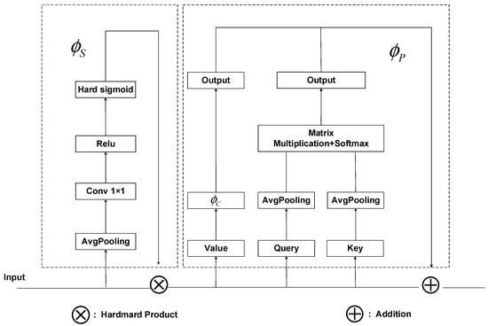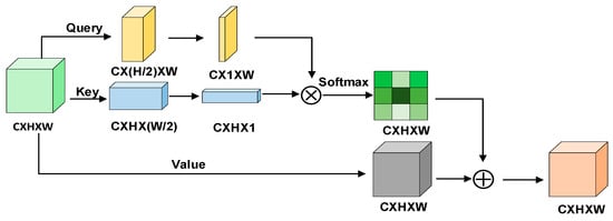 Spatial self-attention obtains the query and key by convolution, which is performed in width and height, and operates average pooling, respectively. Then, it calculates the query and key by matrix multiplication and softmax activation to obtain the spatial similarity matrix, which is shaped as . In this way, the model can identify the relationships between objects in the image. Unlike the transformer block, the input matrix is performed by convolution to obtain the value matrix and add the similarity matrix rather than dot multiplication. The attention module is depicted in Figure 4.
