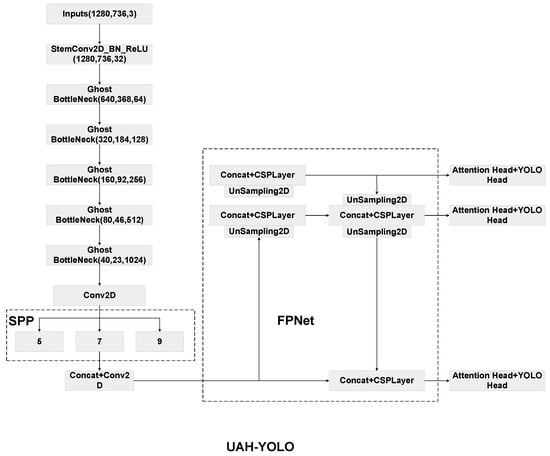 The architecture of our proposed model, UAH-YOLO, based on YOLOX, is illustrated in Figure 6. We replace the CSPDarkNet with GhostNet which is of lower computational complexity and add the united attention head before the YOLO head to obtain the scale, position, and contour information of the targets.