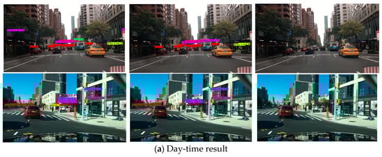 Object detection involves localizing and classifying targets in images, and it is a fundamental task for vision-based assistant driving systems. In recent years, the rapid advancement of DCNN has led to the emergence of numerous outstanding object detection models. For example, region convolutional neural networks (R-CNN) [] is a two-stage object detection algorithm that initially generates proposals and then performs fine-grained object detection. This approach was later developed into Fast R-CNN [], Faster R-CNN [], Mask R-CNN [], etc. On the other hand, YOLO [] is a one-stage object detection algorithm that directly extracts features to classify and localize objects without generating region proposals. RetinaNet [] introduces a novel Focal Loss to address the extreme foreground–background class imbalance problem during training. CenterNet [] detects each object by using a triplet of keypoints to overcome the limitations of a large number of inaccurate object bounding boxes. EfficientDet [] introduces a weighted bi-directional feature pyramid network (BiFPN) and a compound scaling method that uniformly scales resolution, depth, and width.