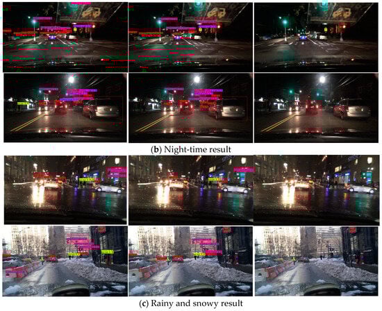 Visualization of the traffic object detection results of UAH-YOLO. (a) Detection results in day-time scenes. (b) Detection results in night-time scenes. (c) Detection results in rainy and snowy scenes.