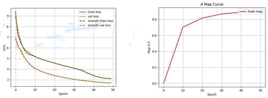 The evaluation indexes used in this paper are Precision (P), Recall (R), AP50, AP50–95. Precision denotes the proportion of correctly predicted true samples among predicted true samples. Recall denotes the proportion of correctly predicted true samples among positive samples. AP is the area under the P–R curve. TP, TN, FP, and FN are the numbers of true positive samples, true negative samples, false positive samples, and false negative samples, respectively. AP50 is the AP when the intersection of union (IOU) of the predicted box and the real box is above 50%. mAP50 is the average AP50 of all classes.