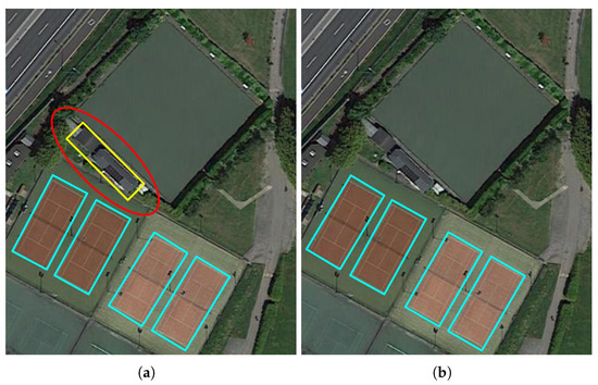 Illustration of misclassification problem. (a) Detection result of OOD model without scene classification. (b) Detection result of our method. The blue and yellow rectangles denote tennis courts and a harbor, respectively. The red circle denotes the misclassification object.