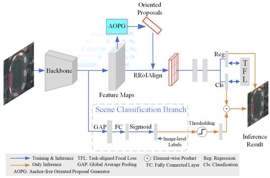 The architecture of the proposed method is illustrated in Figure 2. First of all, the AOPG [] is used to generate high-quality oriented proposals. Secondly, the classification and regression results of each proposal are derived from its features, obtained through the RROI Align operation, and the classification and regression branches are trained by the proposed TFL. Thirdly, a scene classification branch is added on the basis of shared backbone features, and it is trained by the image-level labels derived from the instance-level labels. In the inference stage, the predicted results of the scene classification branch are binarized by a predefined threshold, and they are then used to exclude the impossible categories for object classification. Finally, the refined category scores and predicted offsets of all proposals are jointly used to determine the final detection results. The proposed scene classification branch and TFL are introduced in detail as follows.
