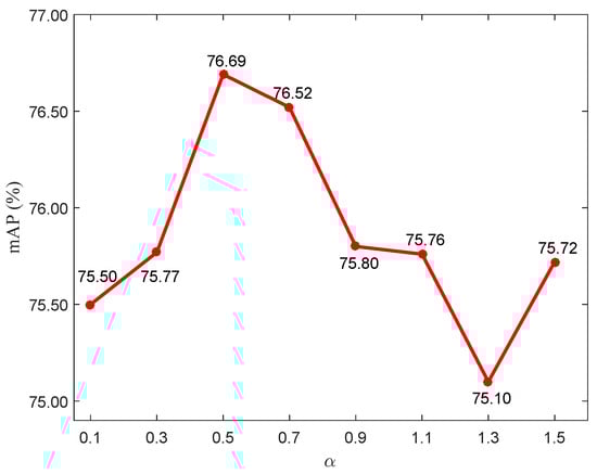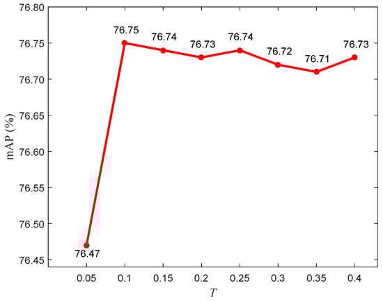 The  (T) in Equation (3) (Equation (8)) is quantitatively analyzed on the DOTA dataset to assess its impact on the final result. As shown in Figure 3 and Figure 4, the highest mAP are obtained at  (); therefore, in this paper the  (T) is set to 0.5 (0.1). As shown in Equation (3), the  is used to control the relative weight of classification loss and BBR loss; therefore, a too-large or too-small value is not suitable for .