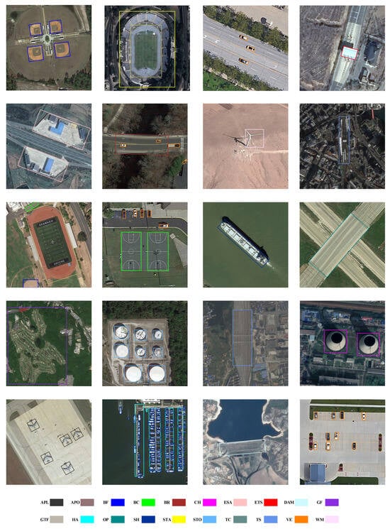 The DIOR-R dataset [] includes 23,463 images with 800 × 800 pixels and 192,518 instances with 20 categories, i.e., aircraft (APL), airport (APO), baseball field (BF), BC, BR, chimney (CH), highway service area (ESA), expressway toll station (ETS), dam (DAM), golf field (GF), GTF, HA, overpass (OP), SH, stadium (STA), storage tank (STO), tennis court (TC), train station (TS), vehicle (VE) and windmill (WM).