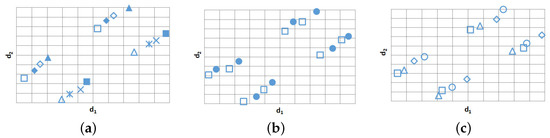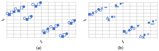 Projection of L in Example 2. Scatter plots of versus in Example 2: (a) points marked by □, solid □, ∘, and • correspond to the level combinations (0,0), (0,1), (1,0), and (1,1) of , respectively; (b) points marked by ∘, ▵, long -, small •, and large •, rectangle, solid ▵, + correspond to the level combinations (0,0), (0,1), (0,2), (0,3) and (1,0), (1,1), (1,2), (1,3) of , respectively; and points marked by short -, ×, *, large solid □, and solid ⋄, ⋄, small solid □, □ correspond to the level combinations (2,0), (2,1), (2,2), (2,3), and (3,0), (3,1), (3,2), (3,3) of , respectively.