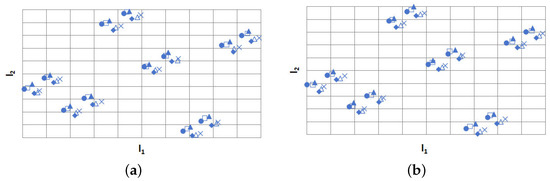 Consider a (2×1)-resolvable orthogonal array is an , where , . Let , , . According to Step 1, we obtain . In Step 2 and Step 3, let , , , for . Then we can obtain the corresponding in . According to Step 4, a is constructed as in Table 7. From Figure 4, we can verify that the rows in corresponding to each level combination of any one or two factors in form an LHD. Obviously, this satisfies the definition of DCD.