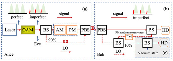 The implementation scheme of the CVQKD system embedded with the high-frequency AM. LO, local oscillator; BS, beam splitter; HD, homodyne detector; PM, phase modulator; OAM, imperfect amplitude modulator; AM, amplitude modulator; PBS, polarization beam splitter. (a) The transmitter, (b) the receiver, and (c) real-time short-noise measurement.